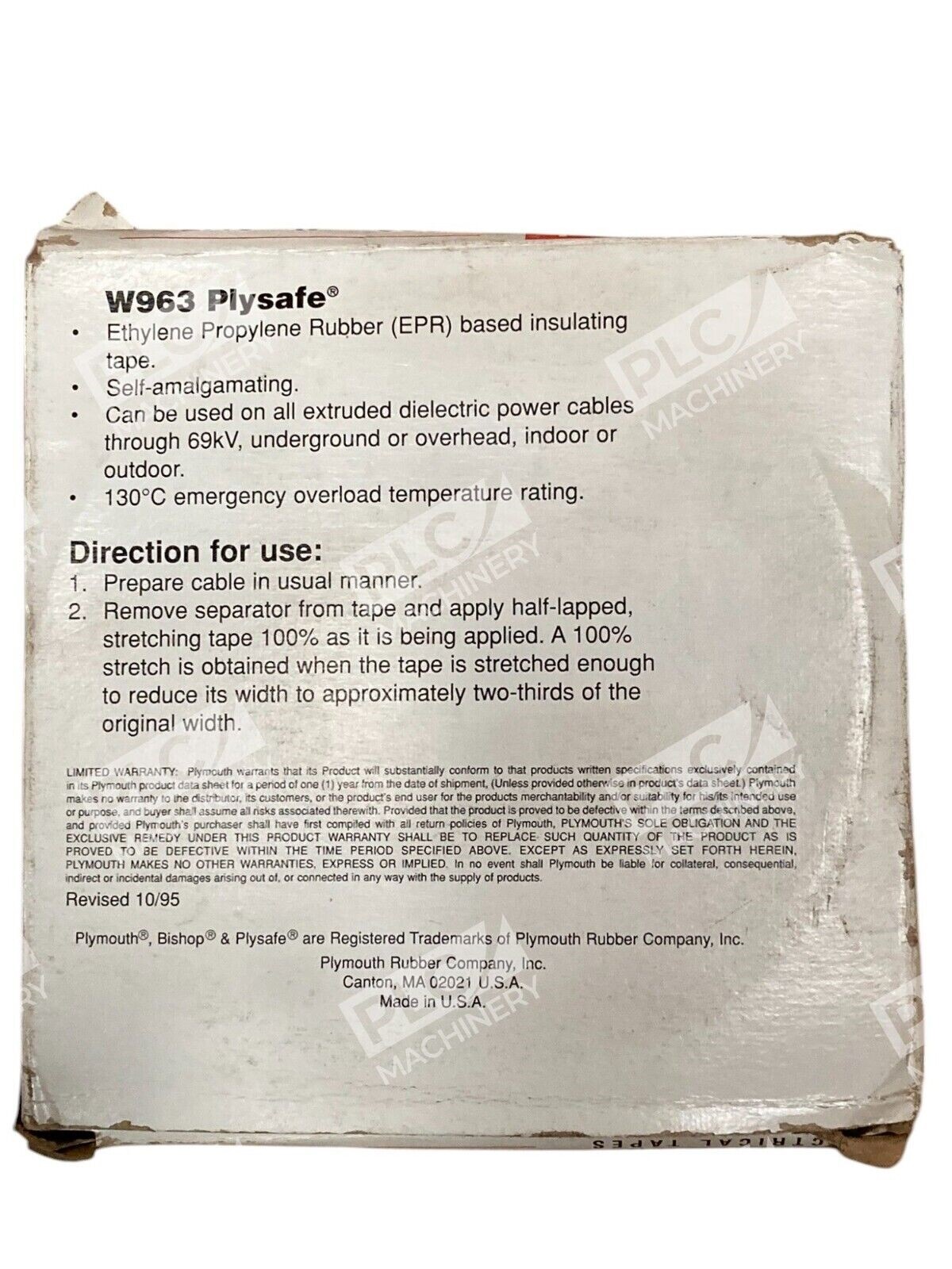 The Plymouth Bishop 3/4″x.03″x30′ Plysafe EPR High Voltage Tape W963 2117 is a high-quality building material designed by Plymouth Bishop. This product is a durable and reliable option for various industrial and commercial applications. With its unique design and model number W963, this tape offers excellent performance and protection in high voltage environments. Made of high-quality materials, it ensures a secure and efficient solution for your building needs.