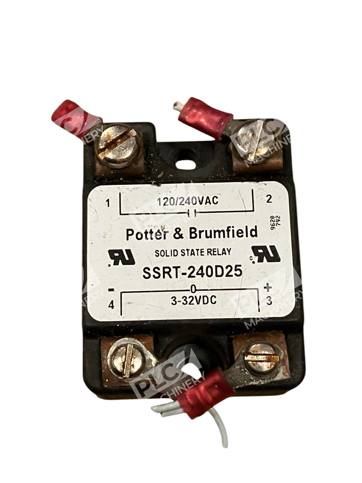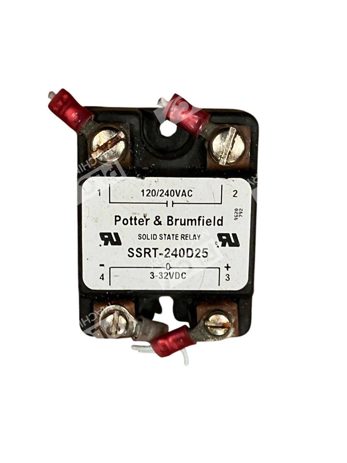 This is a Potter & Brumfield solid state relay with a control voltage range of 2-32VDC and a load voltage range of 120/240VAC. The model number is SSRT-240D25. It is a general purpose relay used in various electrical equipment applications in the industrial sector.
