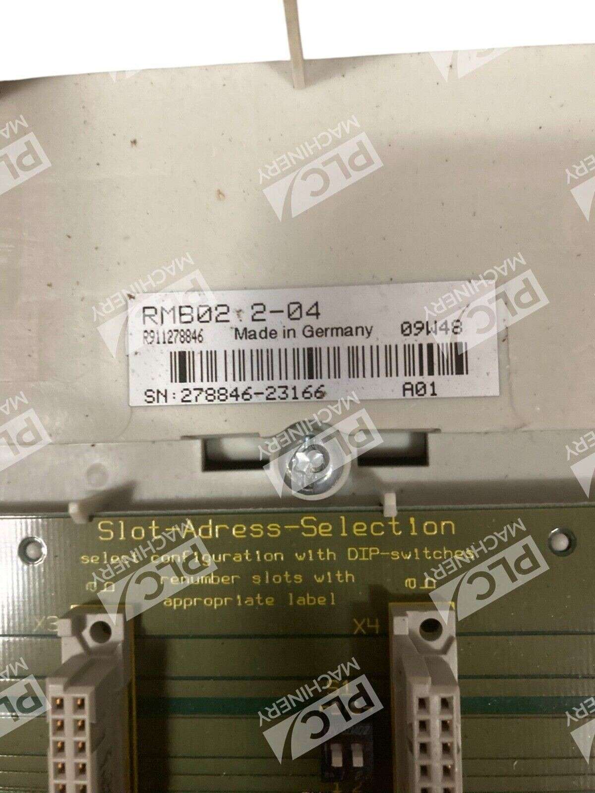 The product is a Rexroth Bosch RMB02.2-04 4 Slot Mounting Assembly Base Plate Module, designed for industrial automation and motion controls. It is a PLC peripheral module that is compatible with REXROTH brand equipment.