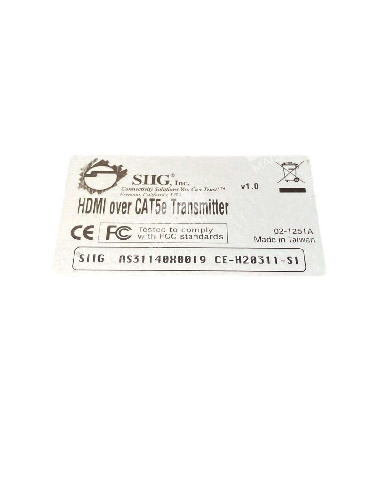 The SIIG HDMI over CAT5e Transmitter (Model: AS31140X0019, Part Number: CE-H20311-S1) is designed to extend HDMI audio and video signals over long distances using a single CAT5e/6 cable.