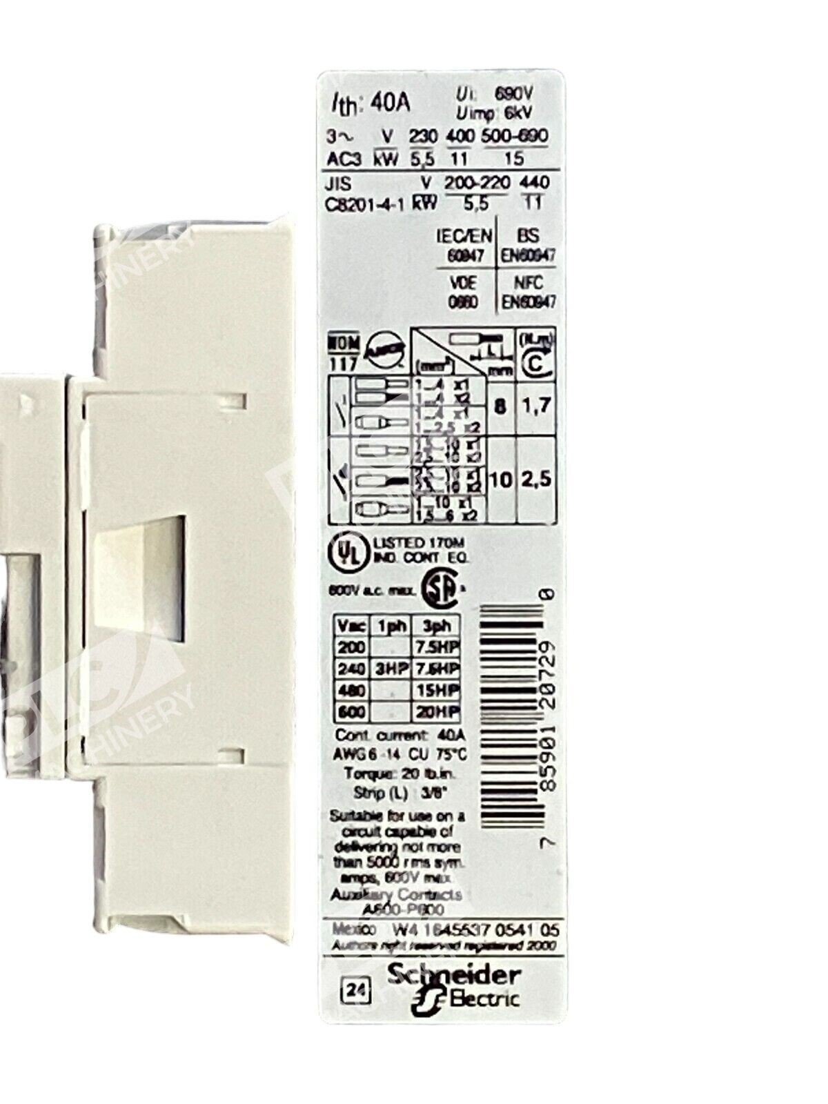 This contactor complies with international standards, ensuring safety and reliability in operation. It is certified under IEC/EN 60947-4-1 and IEC/EN 60947-5-1, making it suitable for global use.