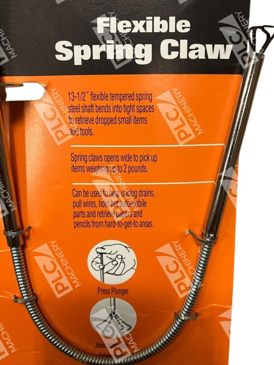 To operate, simply press the plunger to open the jaws, position the tool over the object, and release the plunger to securely grasp and retrieve the item. This mechanism allows for precise control and ease of use in various applications.