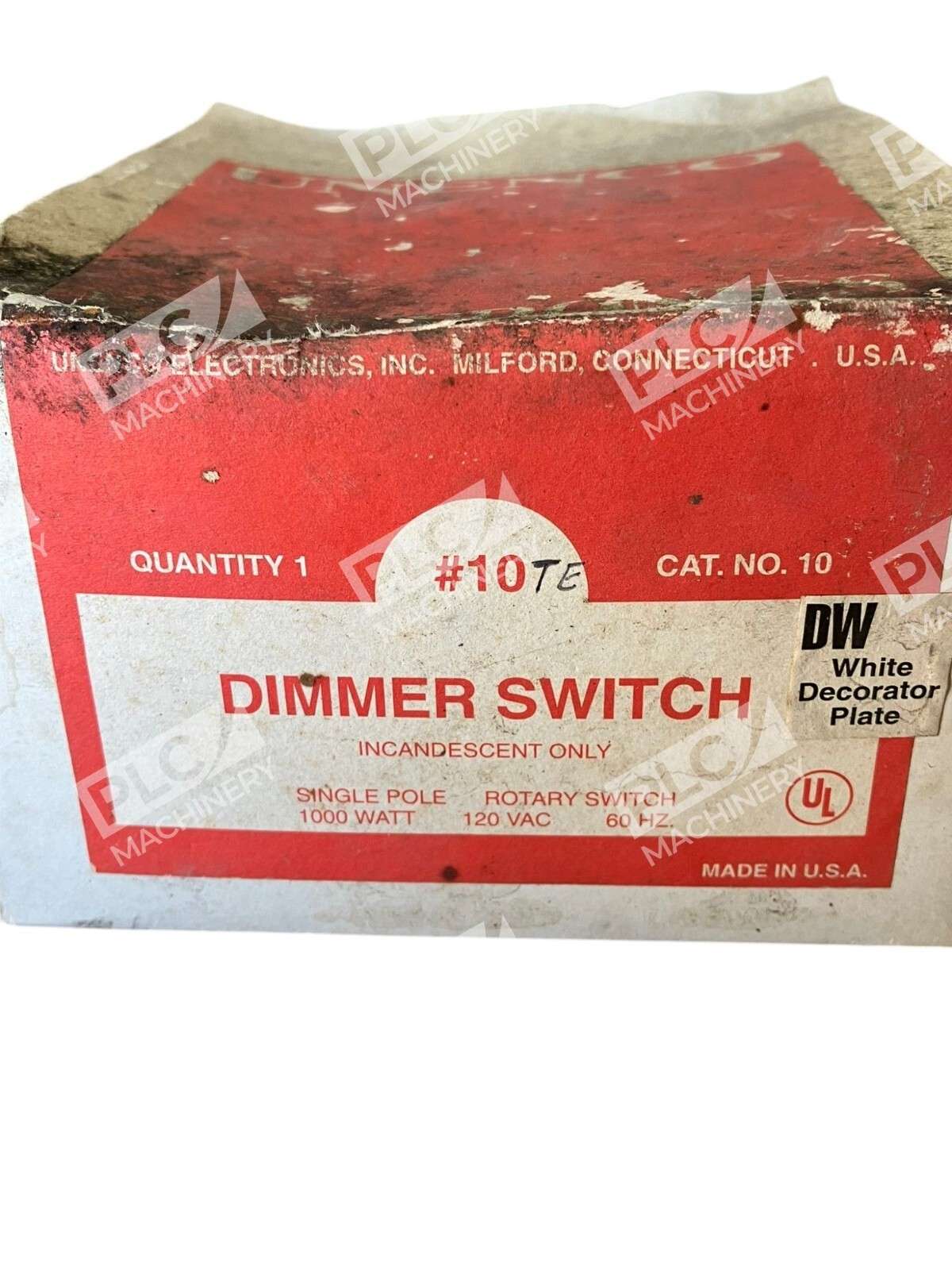 This product is a Hubbell Unenco single pole rotary dimmer switch designed for controlling the brightness of lights. It operates at 1000W with a voltage rating of 120VAC and a frequency of 60Hz. The switch has a rotary style control for adjusting the light intensity.