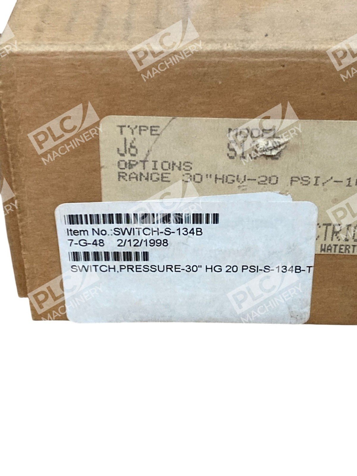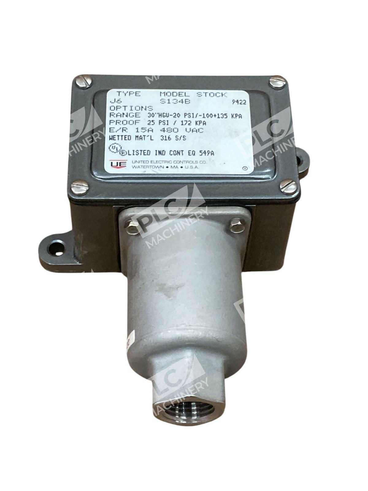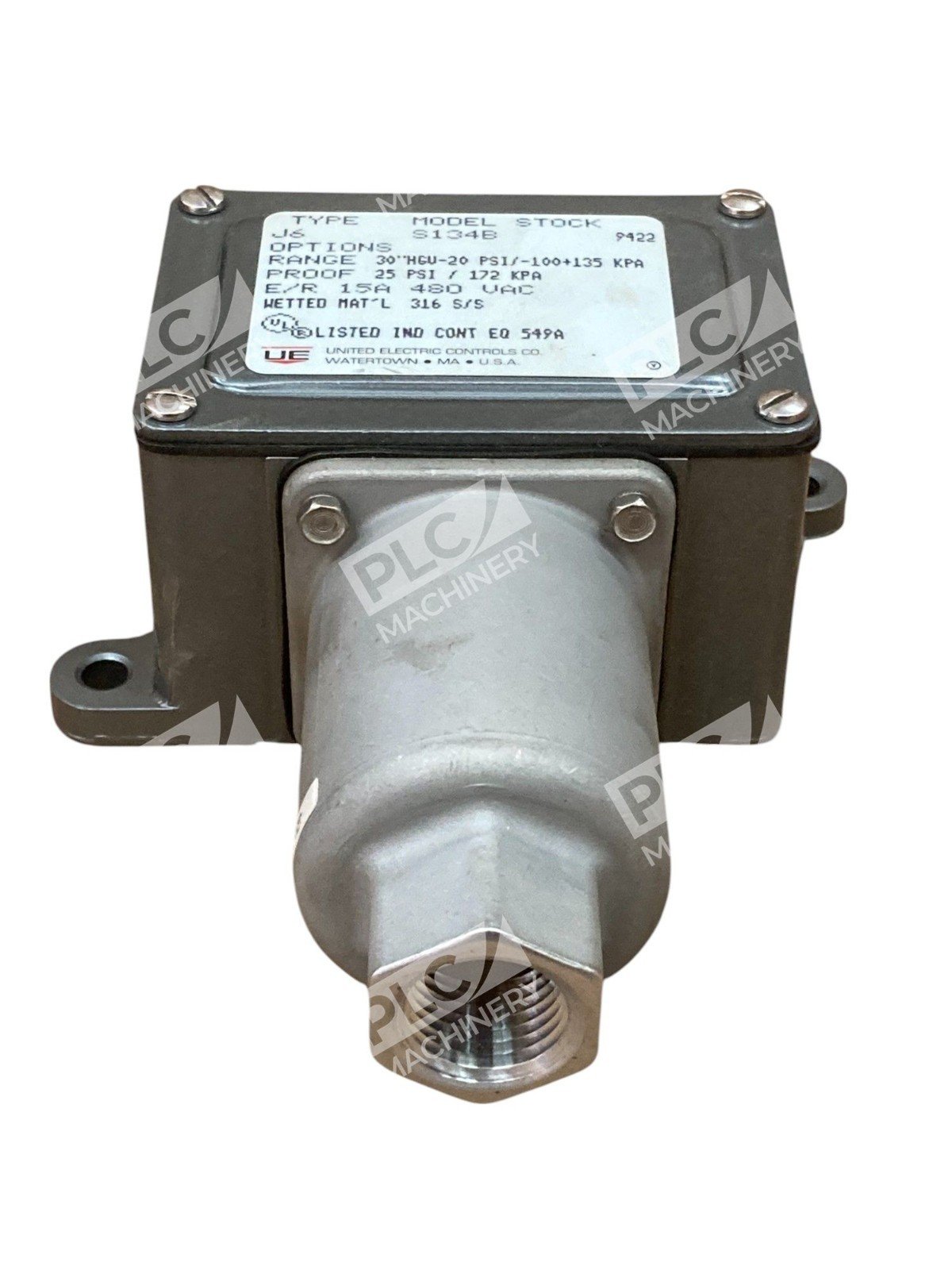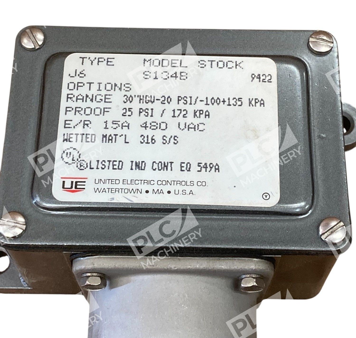 United Electric 30″HGV-20PSI 25PSI 15A 480VAC Pressure Switch J6 S134B 9422
