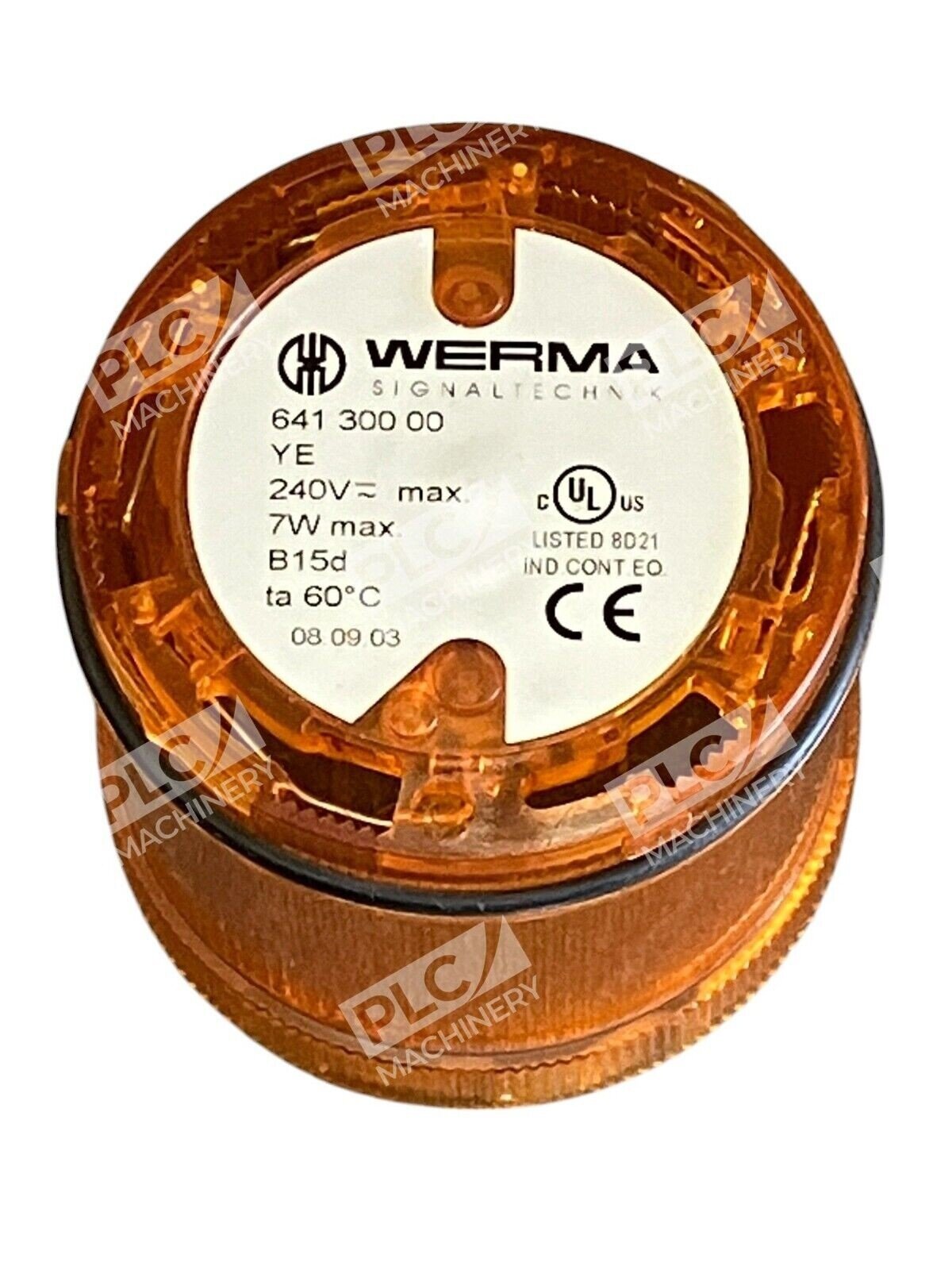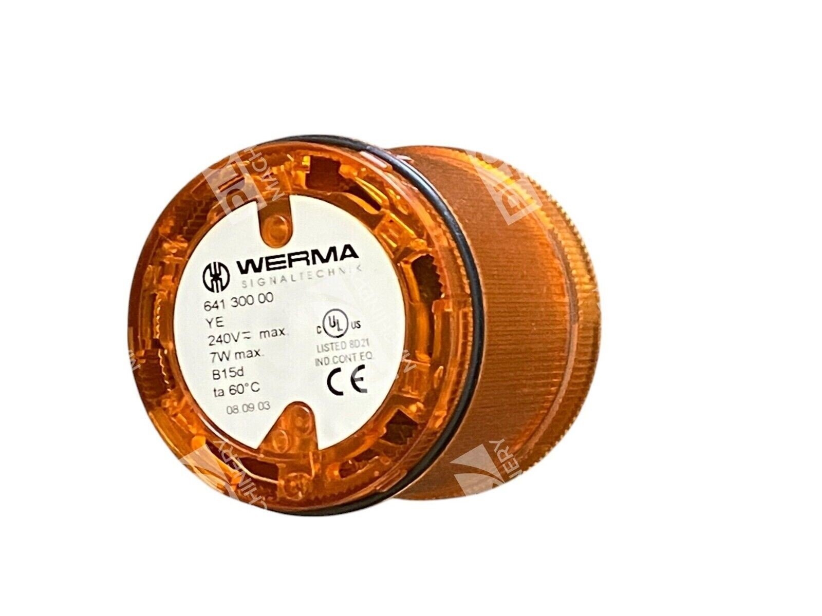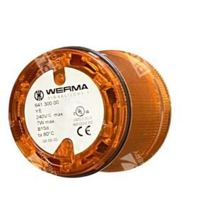 The Werma Signaltechnik 7W B15d 240V Yellow Signal Light, model number 641 300 00, is a high-quality signaling device designed for clear and effective visual communication in industrial environments. Its vibrant yellow lens ensures high visibility, making it ideal for indicating specific statuses or warnings to operators.