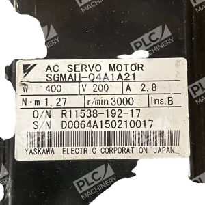 This is a Yaskawa AC Servo Motor model SGMAH-04A1A21, manufactured in Japan. It is a part designed for industrial automation and motion control applications, specifically for servo motors. The model number is R11538-192-17.