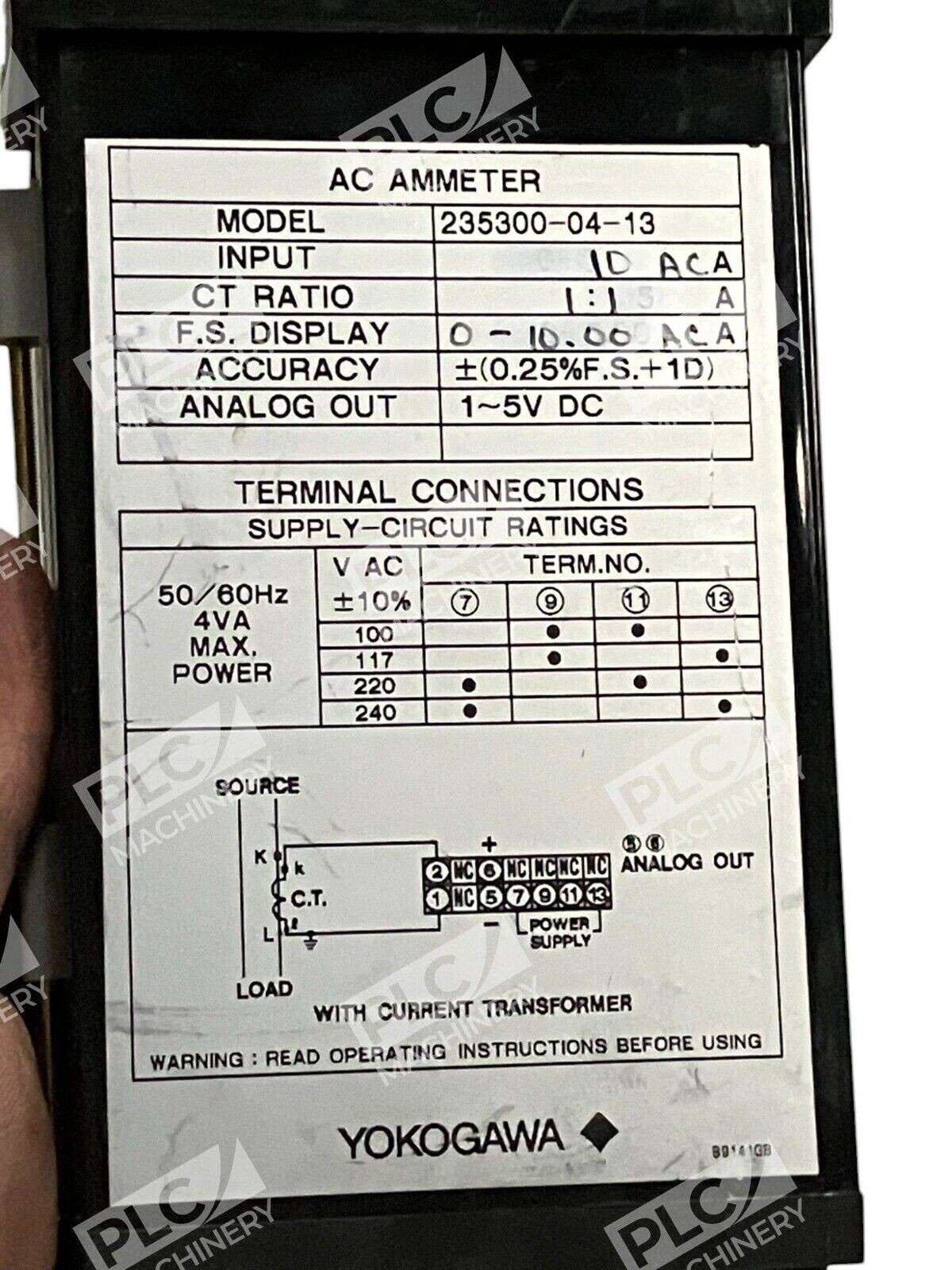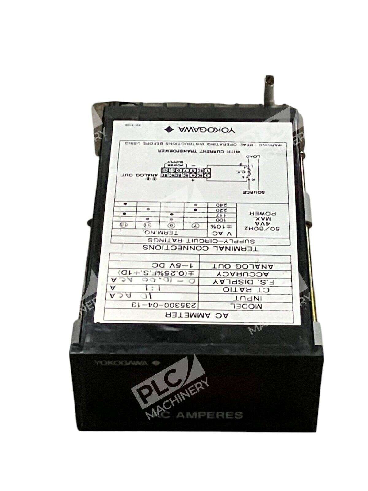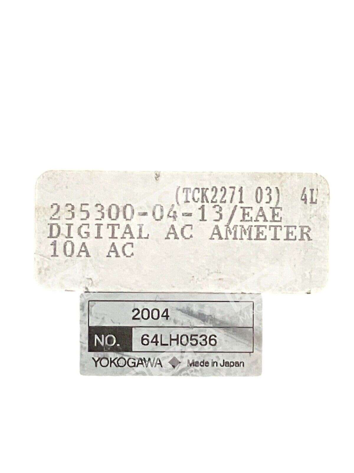 The Yokogawa 235300-04-13 Digital AC Ammeter is a panel meter used for test, measurement, and inspection in industrial settings. It is designed for measuring alternating current (AC) levels with precision and accuracy. The brand of this product is Yokogawa, a reputable manufacturer known for producing high-quality test meters and detectors.